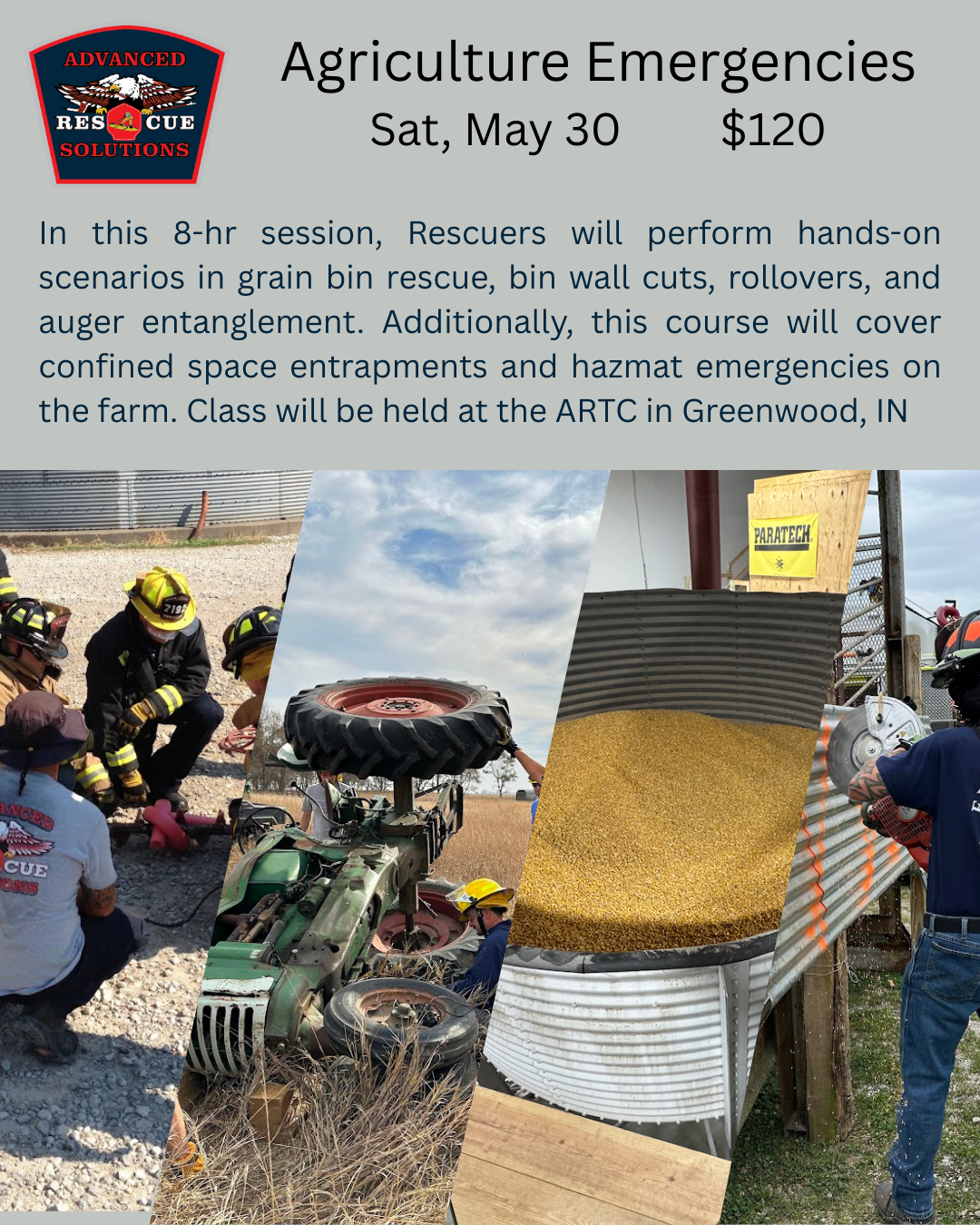 Advanced Rope and Tower Rescue $500.00 Agriculture Rescue $120.00 NFPA Structural Collapse Rescue - Operations $775.00 NFPA Structural Collapse Technician / Structural Collapse Specialist $900.00 Common Sense Technical Rescue $300.00 NFPA Confined Space - Operations/Technician $775.00 Hazardous Materials Technician / OSHA 40Hr from $750.00 NFPA Swiftwater Rescue + Surface Water Rescue $775.00 Paratech Symposium from $150.00 NFPA Rope Rescue - Operations/Technician $775.00 Two Day Technical Rescue Skills Blitz - Jun 15/16 $300.00 NFPA Trench Rescue - Operations/Technician $800.00 NFPA Vehicle Extrication - Operations/Technician $775.00 NFPA Heavy Vehicle Extrication $850.00 ARS Instructor FOG- In stock and shipping now! $25.00 ARS INDUSTRIAL Field Guide $20.00 ARS Tee Shirt $23.00 Collapse Rescue Tee $23.00